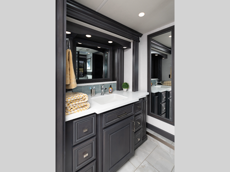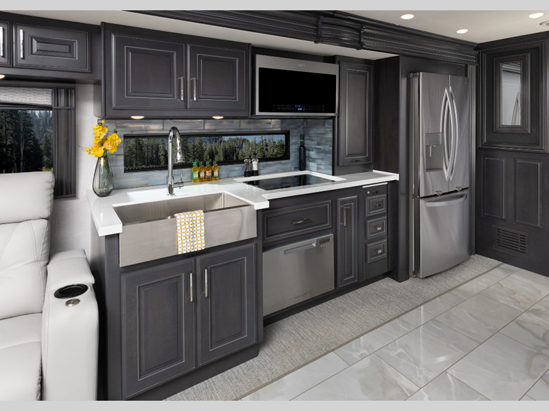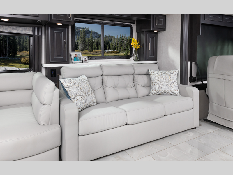 The Cummins L9 engine provides exceptional power, and the Freightliner custom chassis ensures a smooth drive every time. The driver will also appreciate the color backup monitor, the 10.2" stereo with touchscreen navigation, and the LED OptiView instrument panel that will make navigating the road a breeze. Inside, you'll enjoy residential appliances, porcelain tile floors with heat in the living room, residential-style furniture, plus many more luxuries. The three 15K BTU roof A/C's will keep you cool all summer long, plus there is an 8,000-watt Onan quiet diesel generator and 6V deep cycle house batteries to keep you powered up.