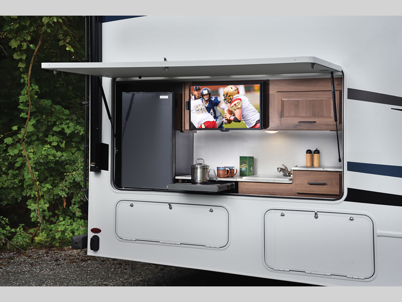 Each model includes an EZ Ryde upgraded suspension system for a smooth drive each time, plus a 10" touch screen and backup camera/side view cameras with a 3-way monitor for easy maneuvering at the campground. The 2" aluminum framed laminated sidewalls and SuperLite composite substrate provide a strong motorhome made to last, and the block foam insulation means you can camp year around. Head inside to find black out roller shades, soft touch self-closing drawer guides, an oxygen-infused shower head, plus a 12V USB charging station to keep your electronics charged and ready to go.