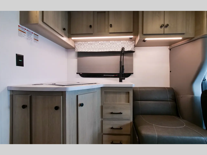 Sleeps 3 Length 25 ft 6 in Ext Width 7 ft 3 in Ext Height 10 ft 5 in Int Height 6 ft 6 in GVWR 10360 lbs Fresh Water Capacity 35 gals Grey Water Capacity 30 gals Black Water Capacity 30 gals Generator 2.8kW Onan Gas Fuel Type Gas Engine Ford EcoBoost 3.5L Chassis Ford Transit Fuel Capacity 25 gals Wheelbase 178 in Available Beds Full Refrigerator Type LP Electric Refrigerator Size 5.3 cu ft Convection Cooking Yes Shower Size 24" x 32" Number of Awnings 1 Axle Weight Front 4130 lbs Axle Weight Rear 7275 lbs LP Tank Capacity 41 lbs Water Heater Type Truma Combi AC BTU 13500 btu Basement Storage 29 cu. ft. TV Info LR 12V LED Flat Panel TV, BR 12V TV Awning Info 14' Power with LED Lights Gross Combined Weight 13500 lbs Shower Type Standard Electrical Service 30 amp Similar Floorplans