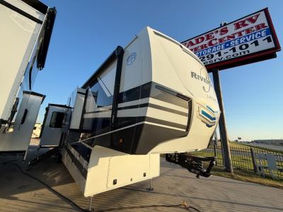 The Forest River RiverStone fifth wheels and toy haulers are super luxurious and convenient for all your camping or full-time needs! These elegant units have standard features that will enhance every aspect of your trip, like a cordless vacuum, 18-cubic foot French door refrigerator with an ice maker, an under-bed storage compartment, and hydraulic slide outs.