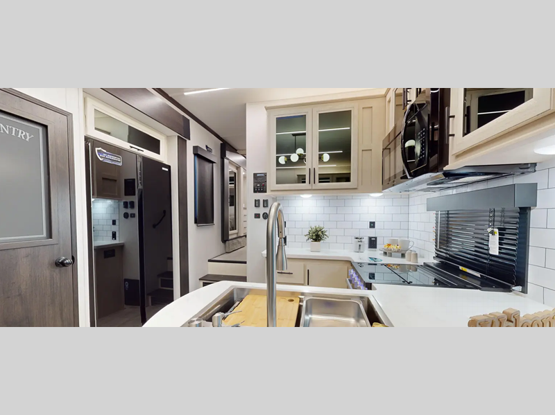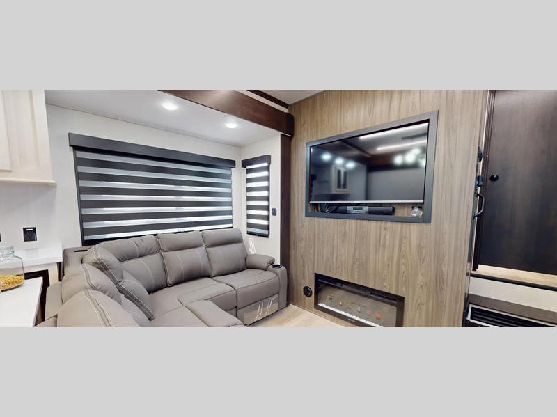 Sleeps 8 Slides 3 Length 45 ft 1 in Ext Width 8 ft 6 in Ext Height 13 ft 4 in Hitch Weight 3435 lbs GVWR 17435 lbs Dry Weight 13000 lbs Cargo Capacity 3386 lbs Fresh Water Capacity 150 gals Grey Water Capacity 80 gals Black Water Capacity 100 gals Tire Size 16" Fuel Capacity 30 gals Number Of Bunks 1 Available Beds King Refrigerator Type 12 Volt Black Glass Residential Style Refrigerator Size 16 cu ft Cooktop Burners 3 Number of Awnings 2 Axle Weight 7000 lbs Garage Size 13 ft Water Heater Type Tankless On Demand AC BTU 30000 btu TV Info LR Large Flat Screen TV Awning Info 10' and 16' Power w/LED Lights Axle Count 2 Washer/Dryer Available Yes Shower Type Angled Electrical Service 50 amp Similar Floorplans