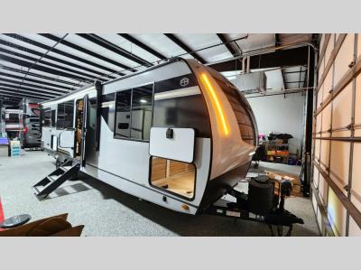 Sleeps 5 Slides 1 Length 34 ft Ext Width 8 ft Ext Height 11 ft 4 in Hitch Weight 875 lbs Dry Weight 6938 lbs Cargo Capacity 2737 lbs Fresh Water Capacity 38 gals Grey Water Capacity 96 gals Black Water Capacity 30 gals Available Beds Custom King Refrigerator Type 12V Refrigerator Size 10.7 cu ft Cooktop Burners 3 Shower Size 36" x 30" Number of Awnings 1 Water Heater Type On Demand Tankless AC BTU 31500 btu TV Info LR TV Awning Info 20' w/LED Lights Axle Count 2 Washer/Dryer Available Yes Shower Type Walk-In Shower Similar Travel Trailer Floorplans