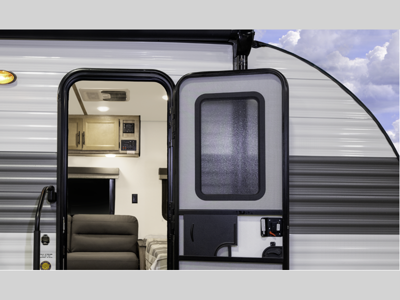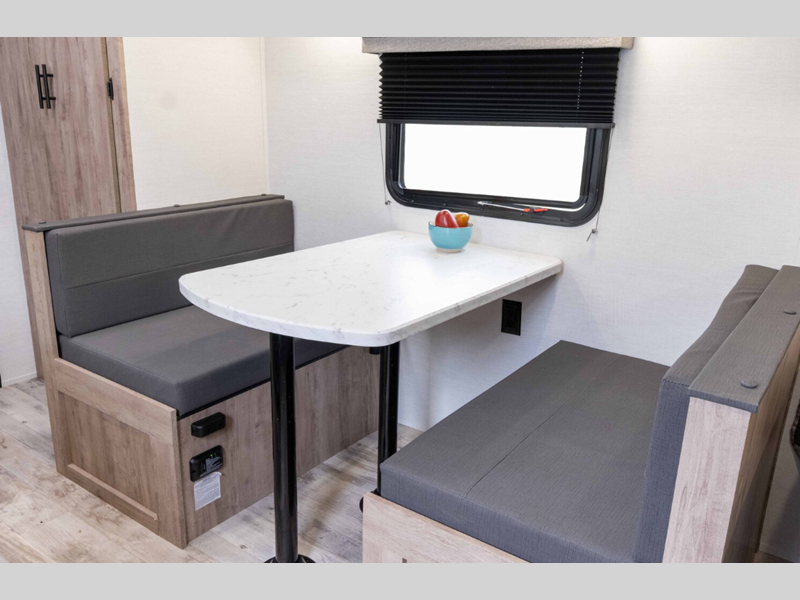 The seamless synthetic vinyl roof and diamond plate lower front provide a durable trailer made to last, and the high-performance vinyl flooring throughout will be easy to keep clean. Each model includes LED interior lights, wood ceiling trim, laminated countertops with vinyl T-molding, and many more interior comforts. You will also appreciate the tankless water heater, the multiple USB ports to keep your electronics charged, and the power awning that will provide shade while you visit outdoors.