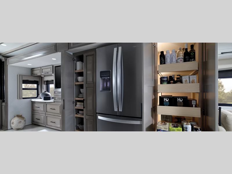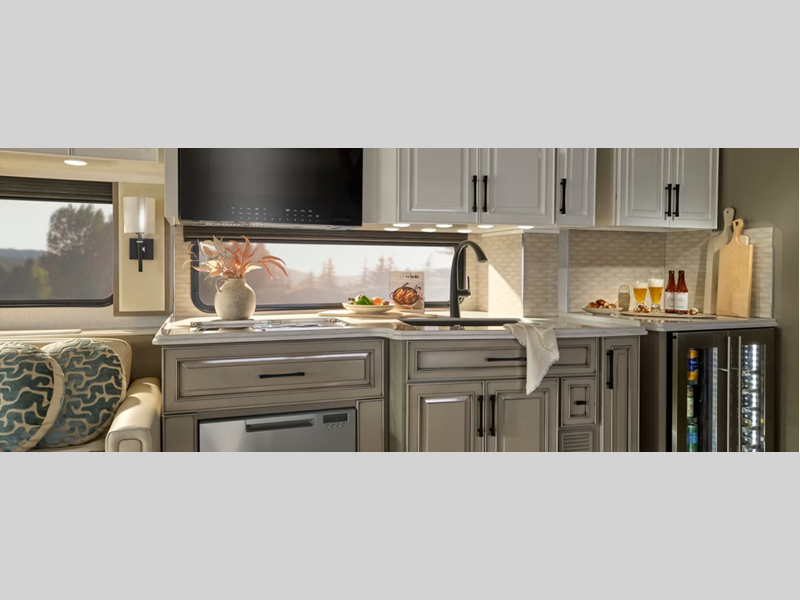 You will love the look of the exterior provided by the industry-exclusive graphics treatment you won't find anywhere else, and there are four interior decor choices and wood choices to make the coach your own. The cockpit is every captain's dream with its Comfort Drive steering system, Onguard collision mitigation technology, Mobileye lane tracking, and more features to make the drive easier than ever. Each model includes super polished solid surface countertops, modern appliances, and leather furniture to name a few luxury comforts.