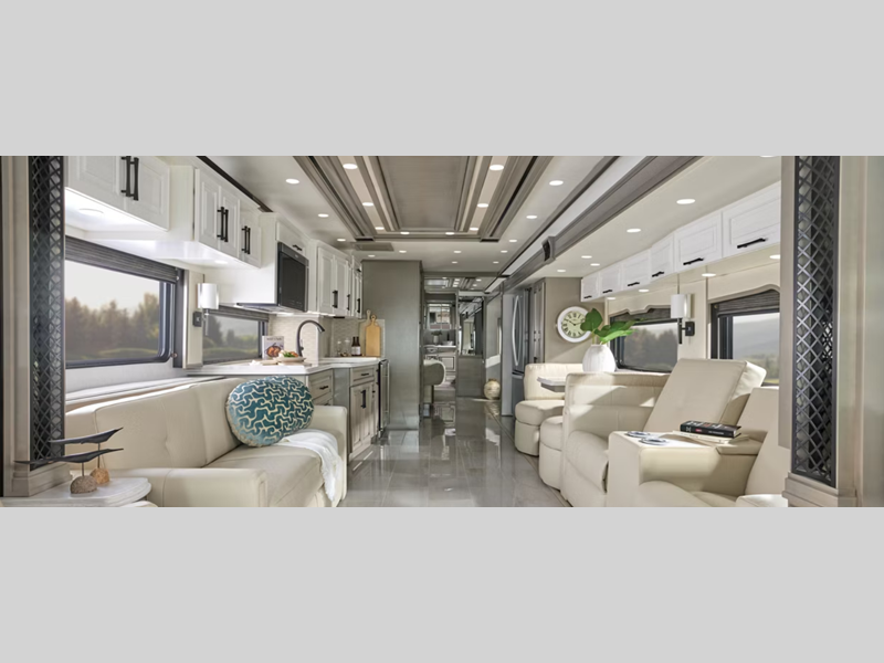 Sleeps 6 Slides 3 Length 44 ft 10 in Ext Width 8 ft 6 in Ext Height 13 ft 4 in Int Height 6 ft 11 in Interior Color Balboa, Wentworth, Alden, Camino Exterior Color Flamborough, Hampshire, Lulworth, Seaford Hitch Weight 20000 lbs GVWR 54000 lbs Dry Weight 46600 lbs Cargo Capacity 8400 lbs Fresh Water Capacity 105 gals Grey Water Capacity 80 gals Black Water Capacity 60 gals Furnace BTU 50000 btu Generator 12.5 KW Cummins Onan Fuel Type Diesel Engine Cummins X Chassis Freightliner Horsepower 605 hp Fuel Capacity 150 gals Wheelbase 292 in Number Of Bunks 1 Available Beds King Torque 1950 ft-lb Refrigerator Type Whirpool Refrigerator Size 19.7 cu ft Convection Cooking Yes Cooktop Burners 3 Shower Size 40" x 30" Number of Awnings 2 Axle Weight Front 20000 lbs Axle Weight Rear 20000 lbs Axle Weight Tag 14000 lbs Water Heater Type Continuous AC BTU 45000 btu TV Info Overhead 43" 4K LED TV, 50" 4K LED TV on Televator, BR LED TV Awning Info Nova Side Awnings Washer/Dryer Available Yes Gross Combined Weight 74000 lbs Shower Type Shower w/Seat Electrical Service 50 amp Similar Floorplans