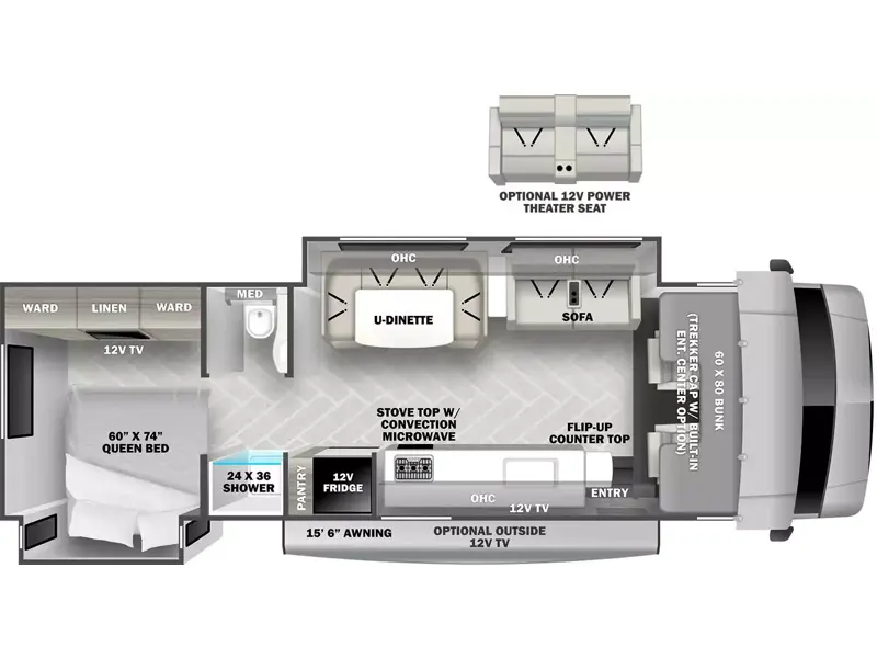 Escape the hustle and bustle of everyday life with this motorhome! It features a 60" x 80" bunk over cab mat which can be switched out for an optional Trekker cap with a built-in entertainment center. The sofa and U-shaped dinette slide offer comfortable places to enjoy meals, socialize, and even sleep once converted. Prepare your best meals with the 10.7 cu. ft. 12V refrigerator, the three burner cooktop, the flip-up countertop, and even the 1.3 cu. ft. undermount convection microwave. The separated bathroom has a 24" x 32" shower across from a toilet with a sink and countertop space, plus it leads directly into the rear private bedroom which has a 60" x 74" queen bed slide across from a linen/12V TV area with wardrobes on either side. You can even add an optional outside 12V TV and stay protected by the 15' 6" power awning!
