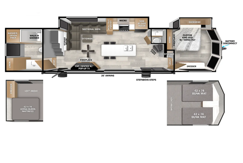 You will feel like you are home when you step inside! Not only will you be impressed with the large slide in the main combined kitchen and living area, but check out the island with four seats! The main entry closest to the front features a step up to a private bedroom featuring a custom king bed with Versa-Tilt within a slide, plus a fireplace, wardrobe, and a dress for your belongings. Just outside this door is a half bath around the corner and a spiral staircase to the front loft with two 42" x 74" bunk mats above. The kitchen is fully equipped for you to provide the best home cooked meals with a roll-out pantry, range and microwave, plus side-by-side refrigerator all part of the large slide that also houses an L-shaped sectional sofa with ottoman so everyone can have a seat! Opposite the sectional find an entertainment center with pop-up TV and fireplace. A second set of stairs leads up to the rear loft featuring a 62" x 74" Versa Queen mattress and a dresser. Back down in the very back of the unit, there is a large bathroom with a walk-in shower, linen cabinet, toilet, and vanity with a sink. There is also a space that has washer/dryer prep to add even more convenience. Outside, a 26' awning for outdoor living, and double entry doors to make it easy to move in and out.