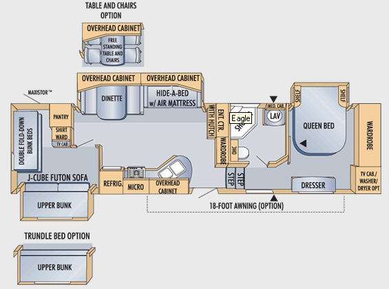 Triple Slide Fifth Wheel, Rear Dbl. Fold-Down Bunks & J-Cube Futon Sofa w/Upper Bunk Slide Out or Trundle w/Upper Bunk Opt., Pantry, Shirt Ward., TV Cab., Booth Dinette or Opt. Free Standing Table w/Chairs & Hide-A-Bed w/Air Mattress Slide Out, Dbl. Kit. Sink, 3 Burner Range/Micro., Refrig., Ent. Cnt. w/Hutch, Ward., Angle Shower, Toilet, Lav. w/Med. Cab., Front Queen w/Shelves Bed Slide, Ward., Dresser, TV Cab. Opt. Wash/Dryer, Opt. 18' Awning & Much.