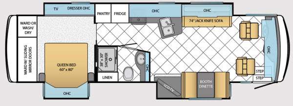 The rear bedroom offers a queen bed slide and a full wardrobe with sliding mirror doors. The wall side has a tv, dresser, pantry, refrigerator, three burner range, double kitchen sink, and sofa.
