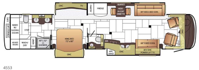 The King Aire 4553 motor home by Newmar features a full wall slide, and comfortable seating for your family and guests.