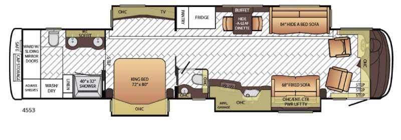 As you enter the motor home, you will see a large slide out along the road side wall that stretches from the living, kitchen, and even into the bedroom. The slide has a hide-a-bed sofa, hide-a-leaf dinette with chairs and buffet, refrigerator, pantry, and TV in the bedroom with overhead cabinets. Across from the sofa is another slide that includes a 68" fixed sofa, entertainment center with power lift TV, overhead cabinets, kitchen sink, countertop space, and a two burner range.