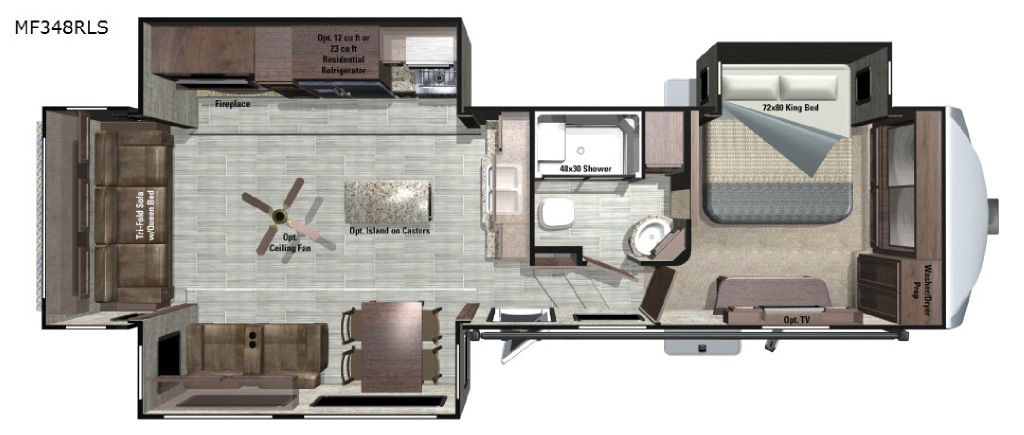 Back down at the main level notice the wide open space thanks to dual opposing slide outs. There is a dining table with four chairs and theater seating for two with cup holders along the curb side. Opposite find a kitchen with a three burner range including overhead microwave oven, refrigerator, pantry, and an entertainment center, plus fireplace all within a slide out. You can even choose an optional 12 cu. ft. refrigerator or 23 cu. ft. residential refrigerator. There is overhead storage and counter space with a double sink along the interior wall, plus an optional center island on casters for added prep space and serving area if you like.