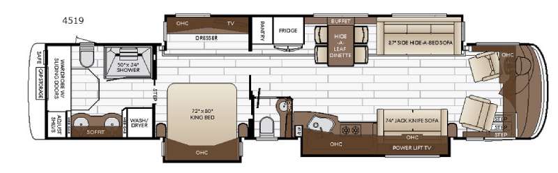 Along the door side there is a slide out with a 74" power jack knife sofa and above the sofa you will find a power lift TV. The slide also has a pull-out drawer dishwasher, two burner range, and large sink. Above the stove and sink there is a large overhead cabinet. Just past the slide there is a convenient half bath with a sink, toilet, and overhead linen cabinet.