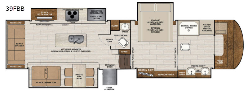 When you choose to camp out with this four-slide Beacon fifth wheel, you are choosing comfort and style! With conveniences such as an island with overhead lights and a large walk-in closet, your camping experience will be easier than ever before. The living area features a 60" theater sofa with cup holders, an 80" sofa bed, and a 50" LED TV on top of a 40" fireplace. For complete privacy, you can rest each evening on the queen-size slide-out bed in the master suite and wake up to shower in your very own full bathroom that includes a sliding pocket door and a double-sink vanity.